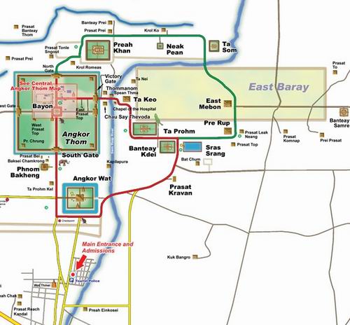 一般來說,吳哥的玩法不外乎就是大環圈跟小環圈,至於兩者的順序就看個人喜好。甚麼是大環圈與小環圈呢?搜尋一下吳哥地圖就會知道,吳哥寺廟群正好有兩條環狀路徑,如同大腸包小腸的橫剖面:香腸路線就是小環圈,而米腸路線就是大環圈。底下這張圖就可以清楚地看到